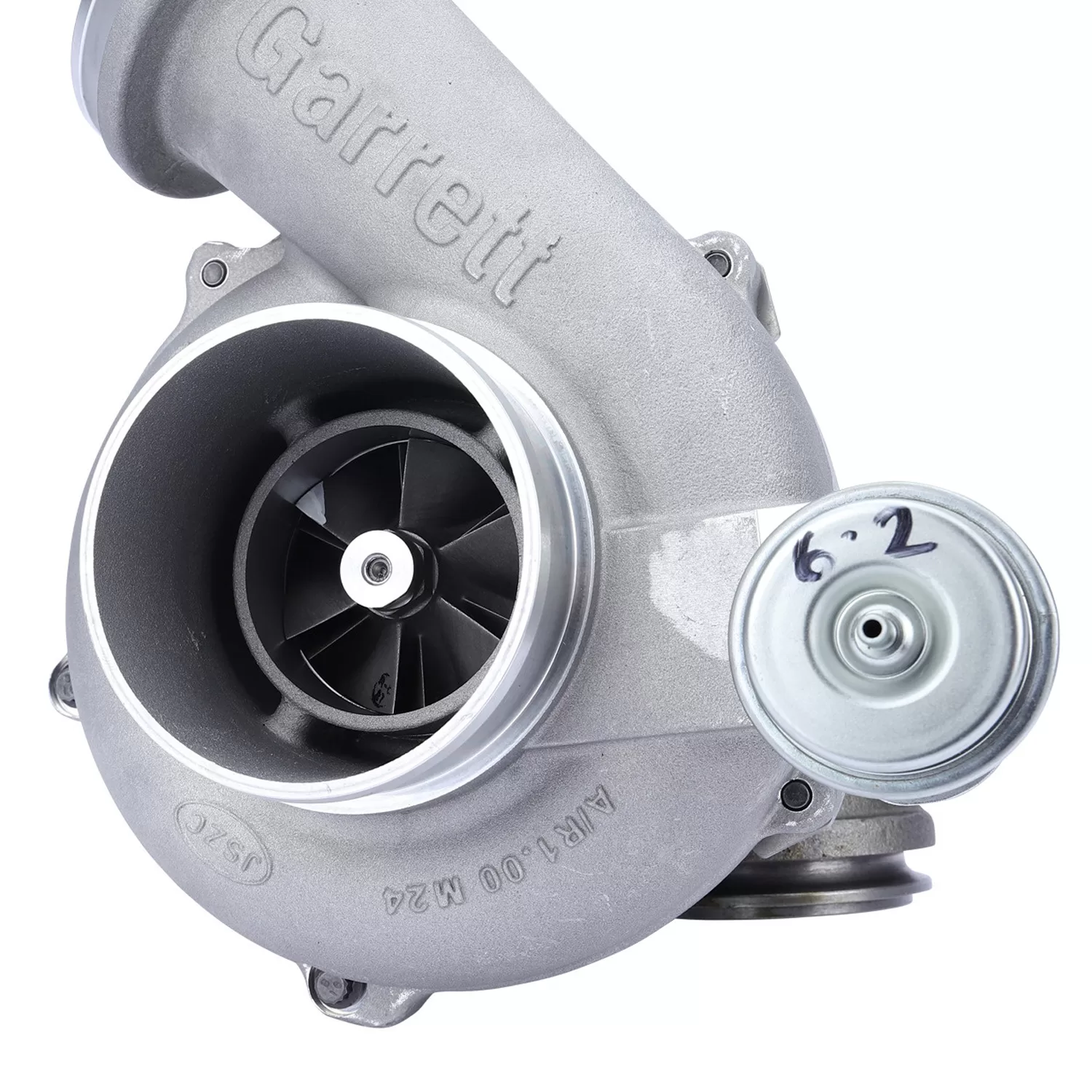 For example, the 2000 model year 7.3L Powerstroke engine produced a stock rating of 235 horsepower at 2,700 RPM and 500 lb-ft of torque at 1,600 RPM. This applies to both automatic and manual transmission configurations.  This Garrett PowerMax turbo is made to handle up to 590 horsepower, which is 2.5 times the stock power level!  So if you have the typical upgrades like a performance chip, exhaust, and intake system, you will still be well within the limits of this turbo.  And, you don’t have to have a lot of upgrades to benefit from the upgrades in this turbo, like the ball bearings that have less drag on the main shaft and produce quicker spool up.
